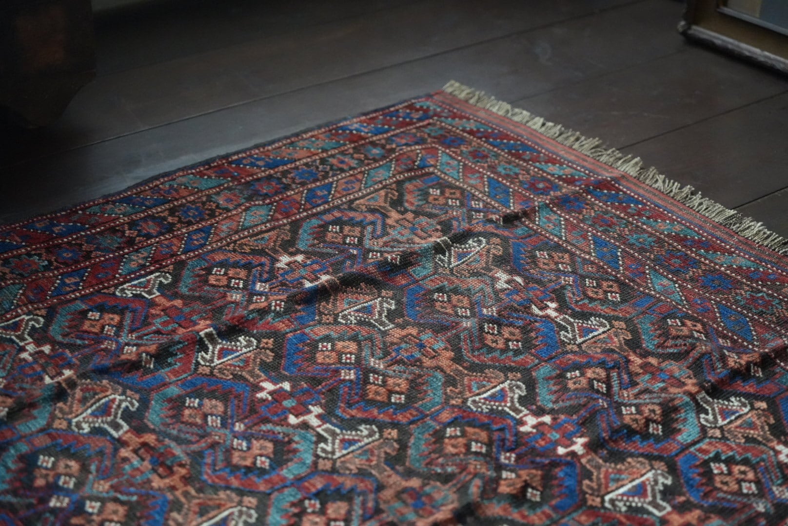 ラグが長い月日をかけて愛されてきた証拠であるほつれ、色褪せ、リペア跡、