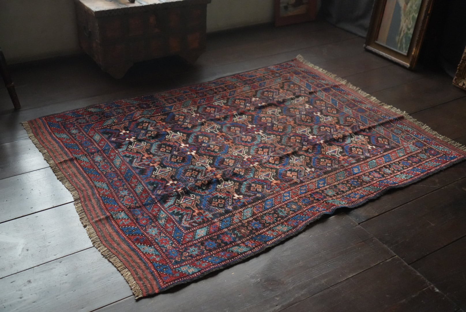 古い手織りのラグには必ず歪みがございます。
