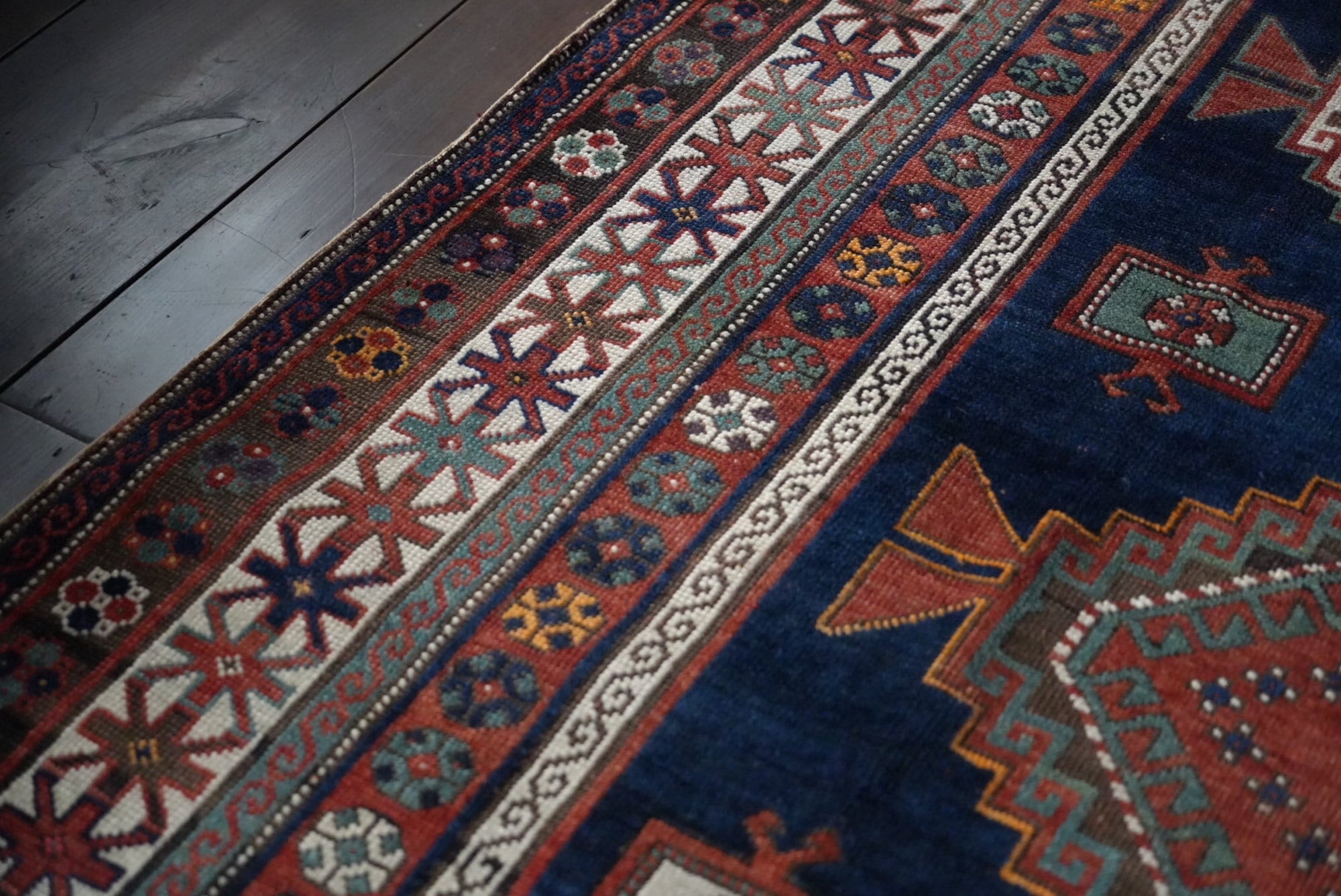 古い手織りのラグには必ず歪みがございます。