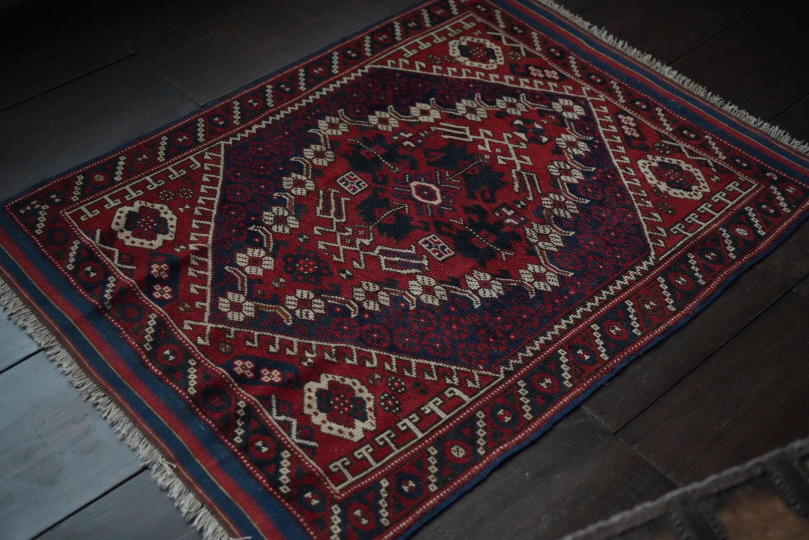 古い手織りのラグには必ず歪みがございます。